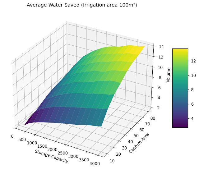 In my situation, where I have a capture area of around 40 m², a storage volume of 2 m³ and and area to water of about 100 m², the model indicates I will save around 10 m³ per season in our climate.